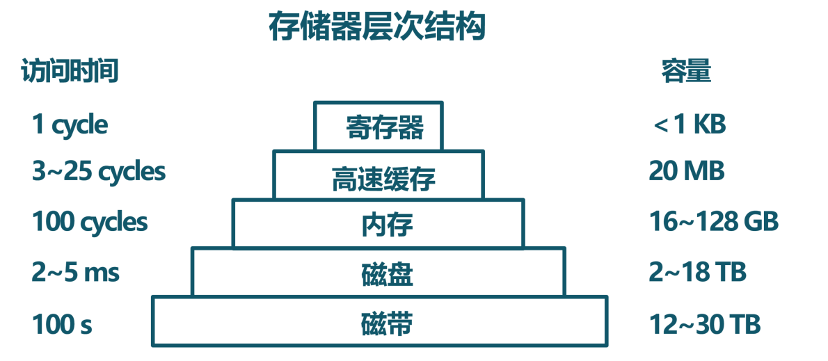 上图是一个典型的内存 / 存储的层次结构,上层比下层速度快但容量小,每一层都可以放置程序用到的代码和数据。这样的存储器层次结构设计是一种典型的工程思维,因为在成本等工程约束下,我们无法在构造出速度最快且容量最大的 “理想” 内存。我们希望基于这种层次结构,加上一定的软硬件优化手段,能够接近 “理想” 内存的目标。要达到这样的目标,需要理解局部性原理。