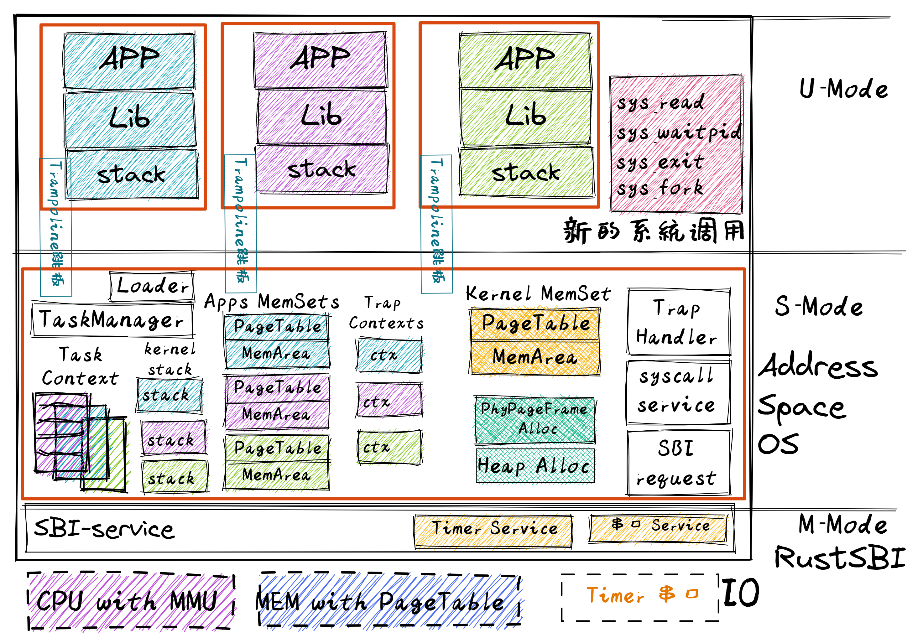 在正式开始这一章的介绍之前,我们可以看到:在前面的章节中基本涵盖了一个功能相对完善的操作系统内核所需的核心硬件机制:中断与异常、特权级、页表,而且一个一个逐步进化的远古生物操作系统内核让应用程序在开发和运行方面也越来越便捷和安全了。