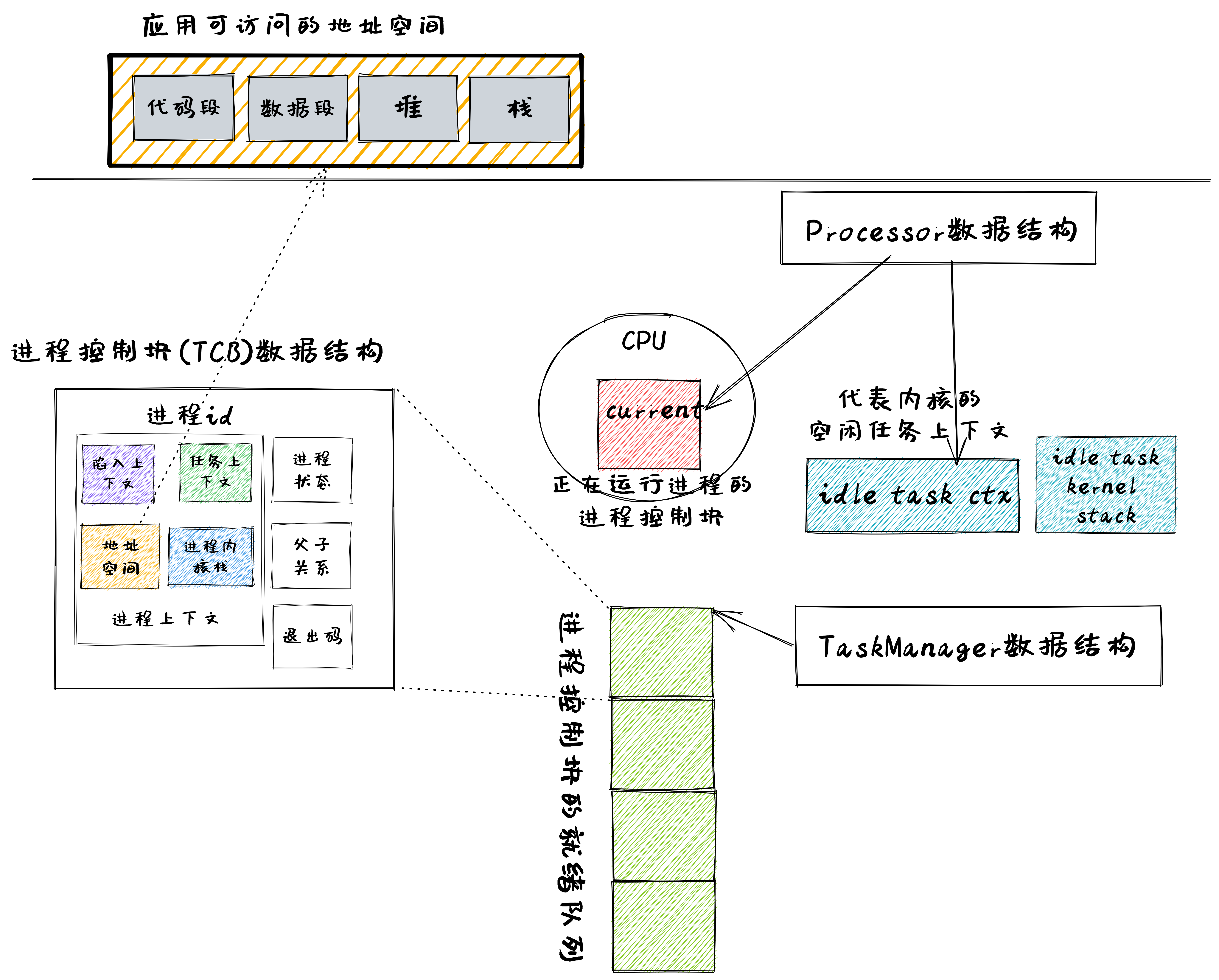 接下来就需要在内核中实现简化版的进程管理机制并支持新增的系统调用。在本章第二小节 进程管理的核心数据结构 中我们对一些进程管理机制相关的数据结构进行了重构或者修改: