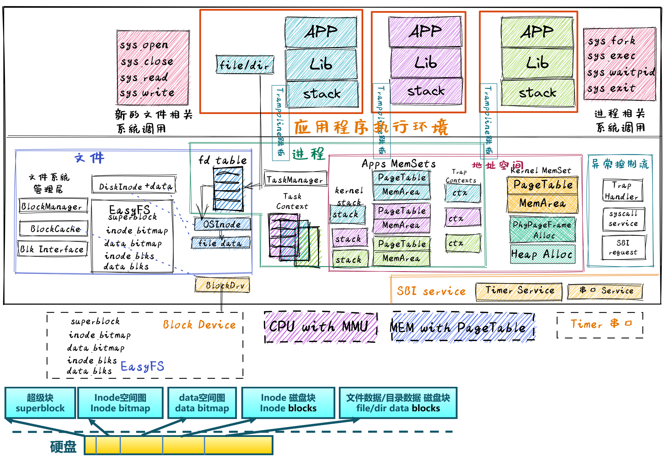 - 在设备管理层面,增加了块设备驱动 – BlockDrv,通过访问块设备数据来读写文件系统与文件的各种数据。