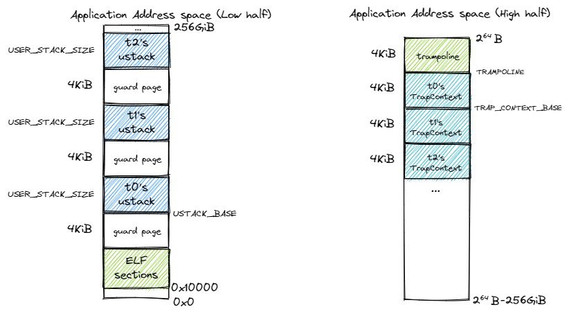 在特权级切换方面,注意到在创建每个线程的时候,我们都正确设置了其用户态线程函数入口地址、用户栈、内核栈以及一些相关信息,于是第一次返回用户态之后能够按照我们的期望正确执行。后面在用户态和内核态间切换沿用的是前面的 Trap 上下文保存与恢复机制,本章并没有修改。有需要的同学可以回顾第二章和第四章的有关内容。