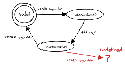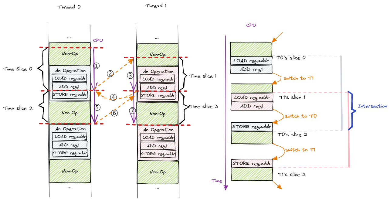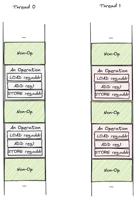 我们可以得出结论:编译器生成的汇编代码是符合我们的预期的。那么接下来进行第二步,操作系统的调度是否会影响结果的正确性呢?在具体分析之前,我们先对汇编代码进行简化,只保留直接与结果相关的部分。那么,可以看成每个线程进行 PER_THREAD 次操作,每次操作按顺序进行下面三个步骤: