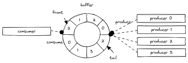 front和tail)整体上视作一种共享资源,那么生产者和消费者的写入和读取都会对这个共享资源进行修改。注意 信号量只保证无可用资源时进行阻塞,但并不保证访问共享资源的互斥性,甚至这可能是两种不同资源 。因此,我们还==需要引入互斥锁对缓冲区进行保护,这里使用一个 N=1 的二值信号量来实现==。