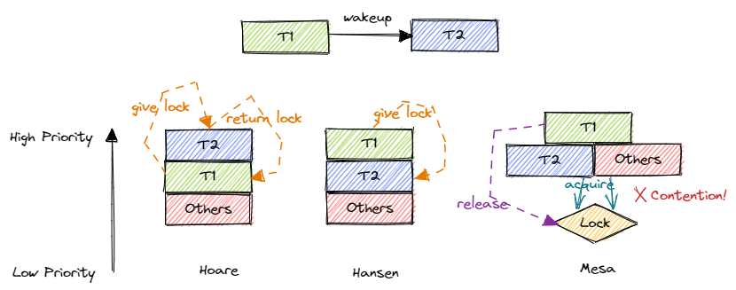可以看出, Hoare 和 Hansen 语义的区别在于 和 的优先级顺序不同。