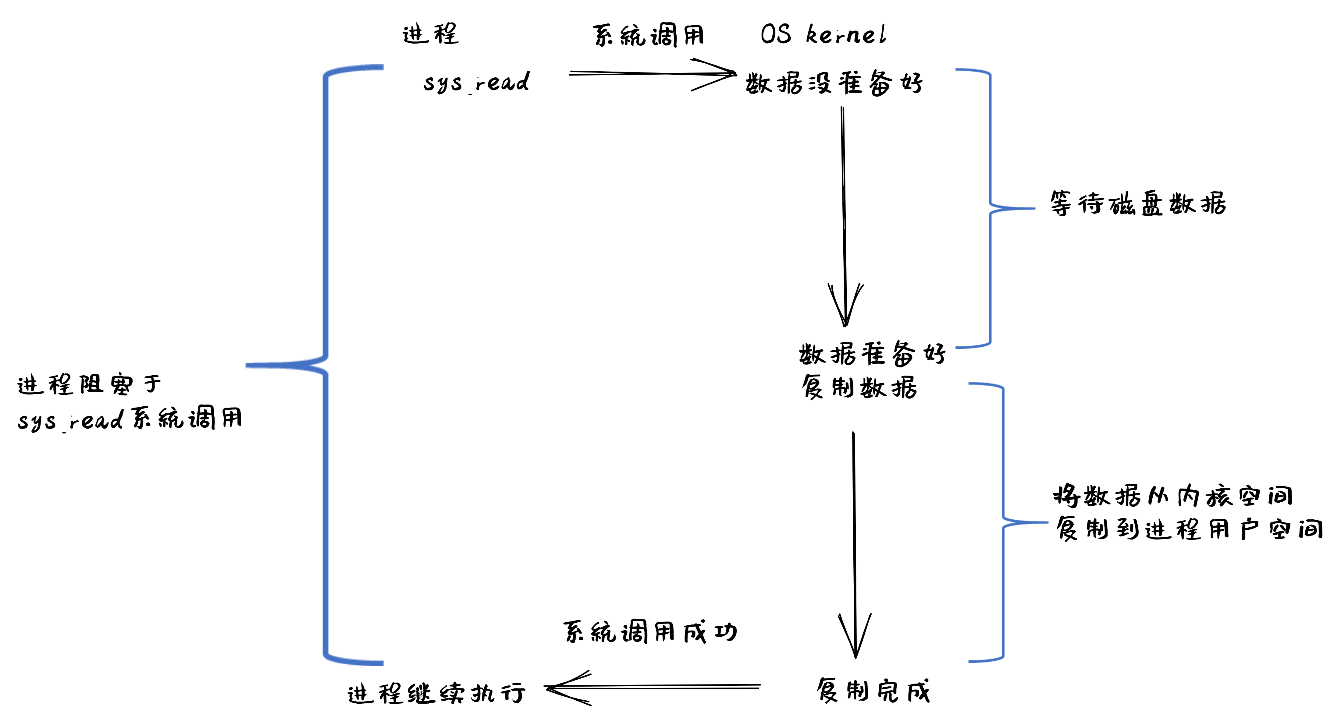 阻塞 IO:在用户进程发出 IO 系统调用后,进程会等待该 IO 操作完成,而使得进程的其他操作无法执行。