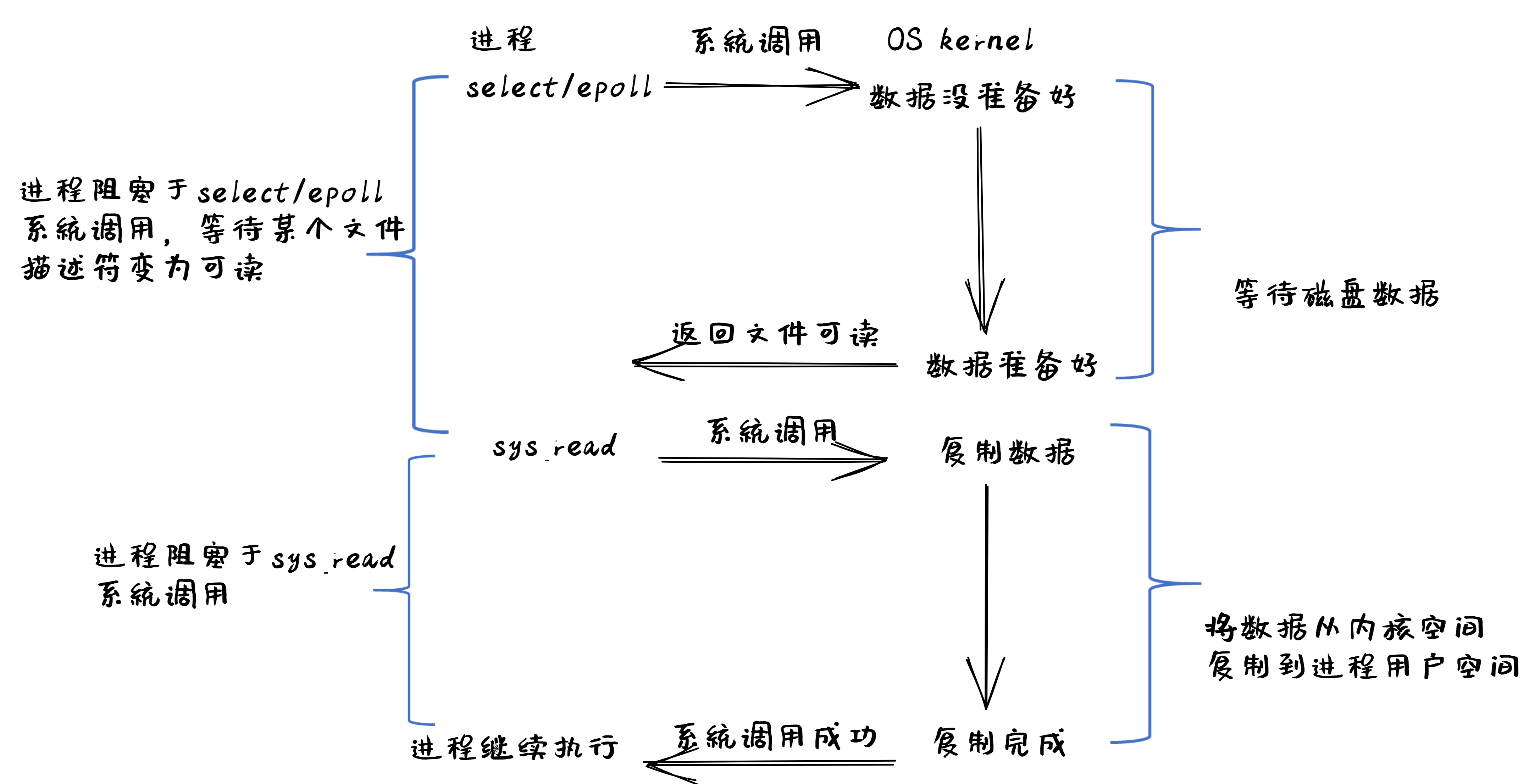 select或epoll系统调用来不断地轮询用户进程关注的所有文件句柄或 socket,当某个文件句柄或 socket 有数据到达了,select或epoll系统调用就会返回到用户进程,用户进程再调用read系统调用,让内核将数据从内核的 I/O 缓冲区拷贝到用户进程的 buffer 中。