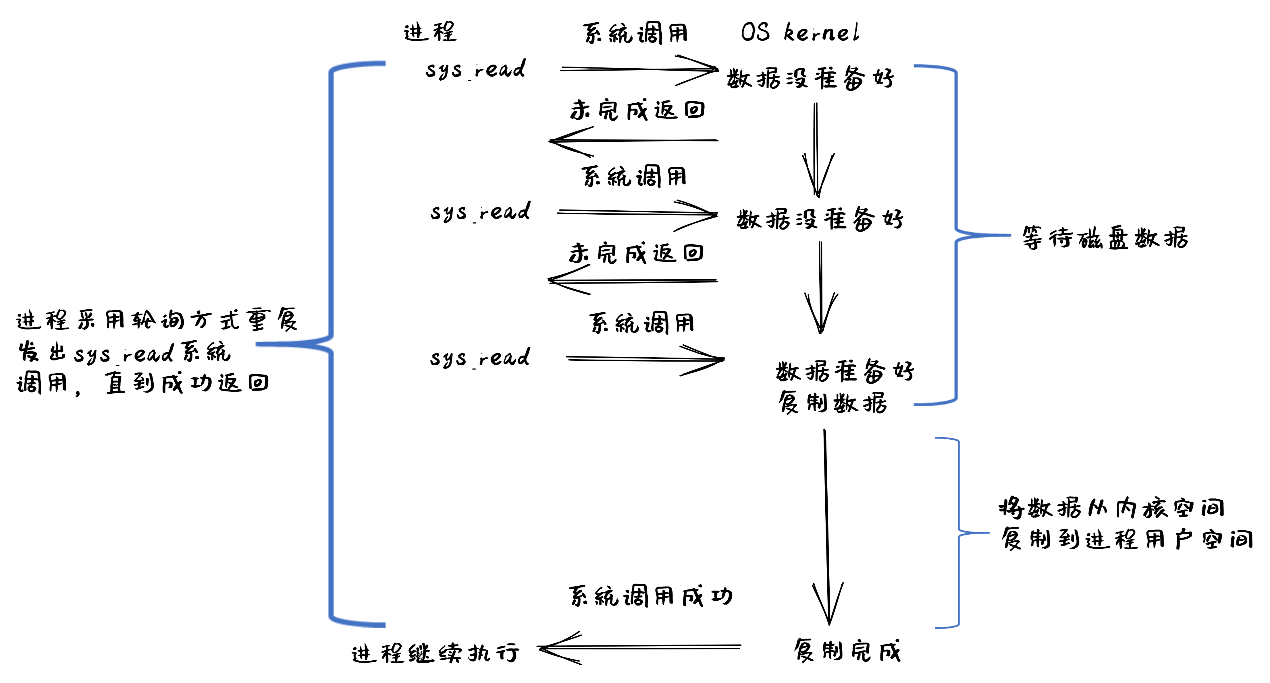 用户进程判断结果是一个 error 时,它就知道数据还没有准备好,于是它可以等待一段时间再次发送 read 操作(这一步操作可以重复多次);