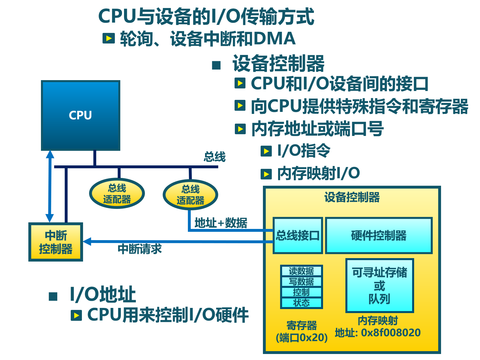 在后面的小节中,我们会进一步介绍基于 I/O 控制器的轮询,中断等方式的设备驱动的设计与实现。