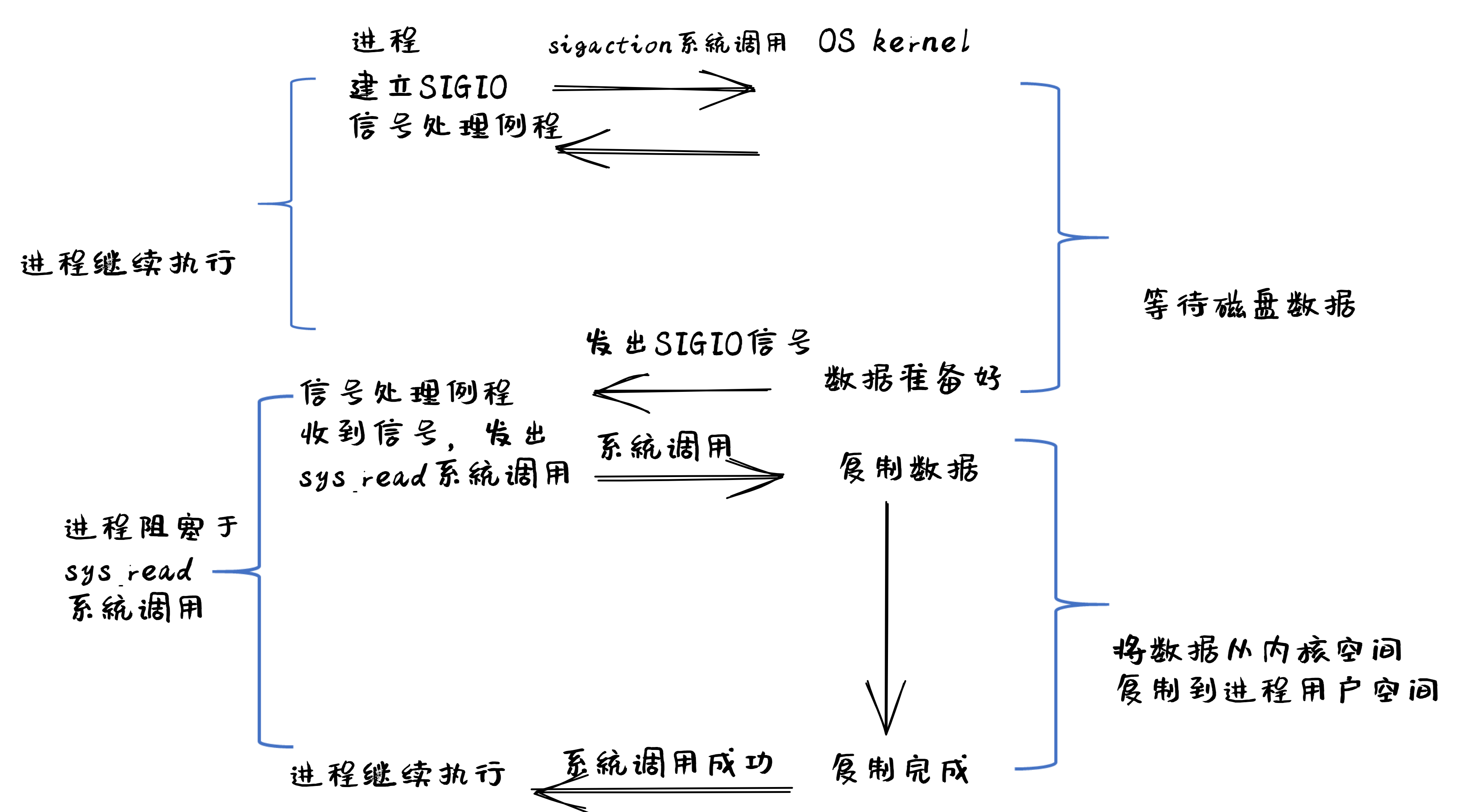 基于信号驱动 IO 模型的文件读的执行过程如下图所示: