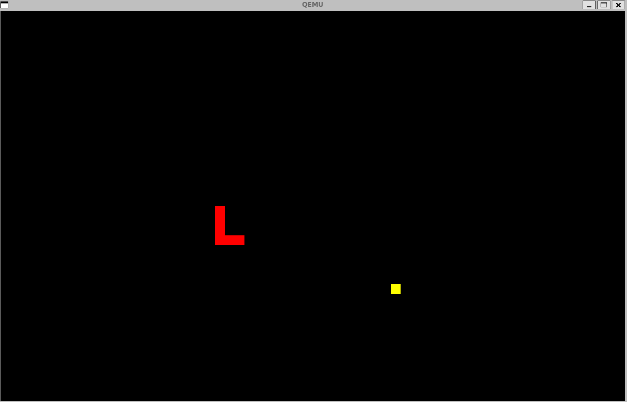 这样,我们结合串口和 virtio-gpu 两种外设,并充分利用已有的 Rust 库,设计实现了一个 贪吃蛇 小游戏(如下图所示)。至此,基于侏罗猎龙操作系统的图形应用开发任务就完成了。