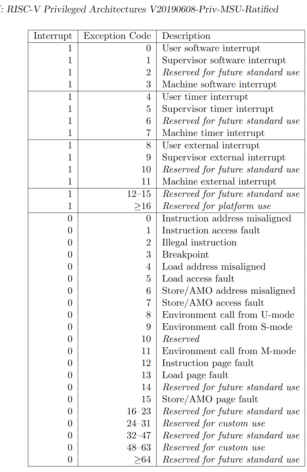具体支持的异常和中断,参见 RISC-V 特权集规范 The RISC-V Instruction Set Manual Volume II: Privileged Architecture 。其它很多问题在这里也有答案。