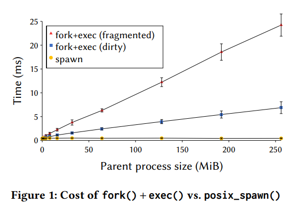 1. 性能数据对比: 比较了 fork+exec 和 posix_spawn 的性能, 显示随着进程大小增大, fork 的时间开销显著增加。