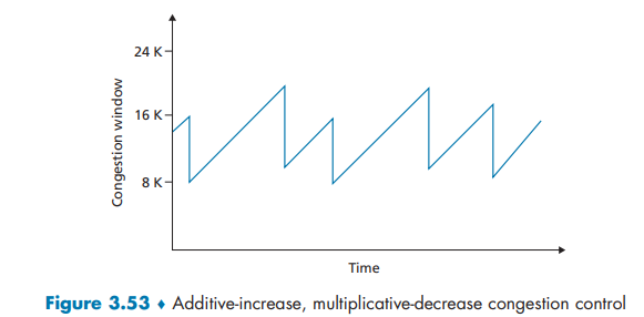 - 发送速率减半,进而每过一个 RTT 就发送速率增加 MSS/RTT,直到再次增长到 W/RTT 为止,这一过程不断重复