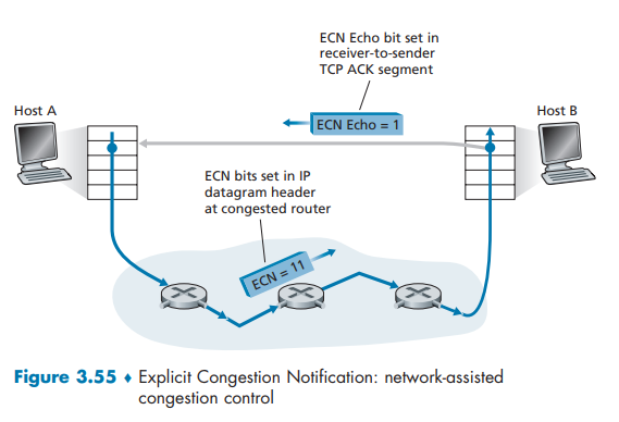 As shown in Figure 3.55, when the TCP in the receiving host receives an ECN congestion indication via a received datagram, the TCP in the receiving host informs the TCP in the sending host of the congestion indication by setting the ECE (Explicit Congestion Notification Echo) bit (see Figure 3.29) in a receiver-to-sender TCP ACK segment.