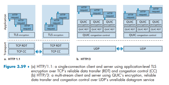 - Connection-Oriented and Secure. Like TCP, QUIC is a connection-oriented protocol between two endpoints. This requires a handshake between endpoints to set up the QUIC connection state. Two pieces of connection state are the source and destination connection ID. All QUIC packets are encrypted, and as suggested in Figure 3.58, QUIC combines the handshakes needed to establish connection state with those needed for authentication and encryption, thus providing faster establishment than the protocol stack in Figure 3.58 (a), where multiple RTTs are required to first establish a TCP connection, and then establish a TLS connection over the TCP connection.