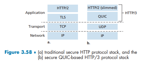 As shown in Figure 3.58, QUIC is an application-layer protocol, using UDP as its underlying transport-layer protocol, and is designed to interface above specifically to a simplified but evolved version of HTTP/2. In the near future, HTTP/3 will natively incorporate QUIC [HTTP/3 2020].