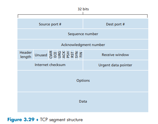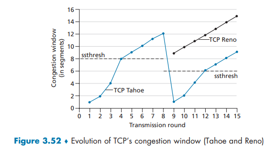 Indeed, it’s probably not even correct anymore to refer to “the” TCP protocol; perhaps the only common features of these protocols is that they use the TCP segment format that we studied in Figure 3.29, and that they should compete “fairly” amongst themselves in the face of network congestion! For a survey of the many flavors of TCP, see [Afanasyev 2010] and [Narayan 2018].