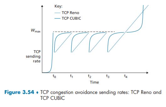 Using this formula, we can see that in order to achieve a throughput of 10 Gbps, today’s TCP congestion-control algorithm can only tolerate a segment loss probability of 2 · 10–10 (or equivalently, one loss event for every 5,000,000,000 segments)—a very low rate. This observation has led a number of researchers to investigate new versions of TCP that are specifically designed for such high-speed environments; see [Jin 2004; Kelly 2003; Ha 2008; RFC 7323] for discussions of these efforts.
