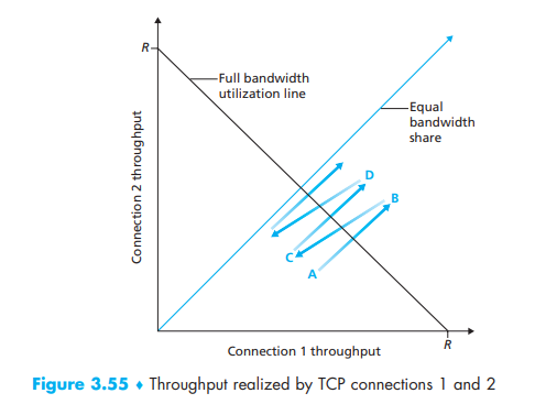 - connections 1 and 2 realize throughputs indicated by point A in Figure 3.55. Because the amount of link bandwidth jointly consumed by the two connections is less than R, no loss will occur, and both connections will increase their window by 1 MSS per RTT as a result of TCP’s congestion-avoidance algorithm. Thus, the joint throughput of the two connections proceeds along a 45-degree line (equal increase for both connections) starting from point A.