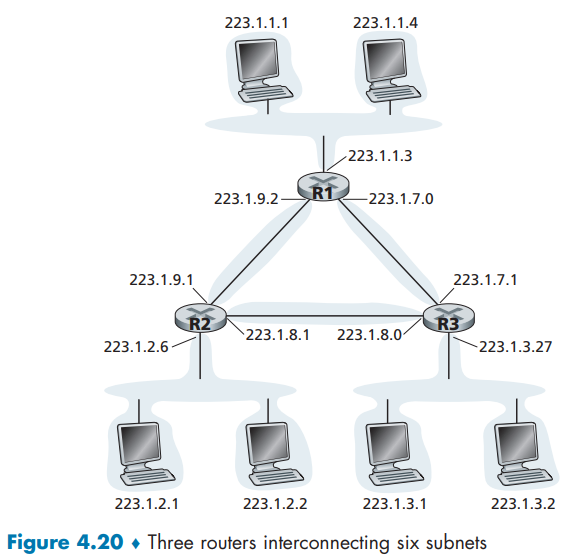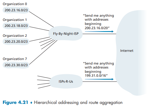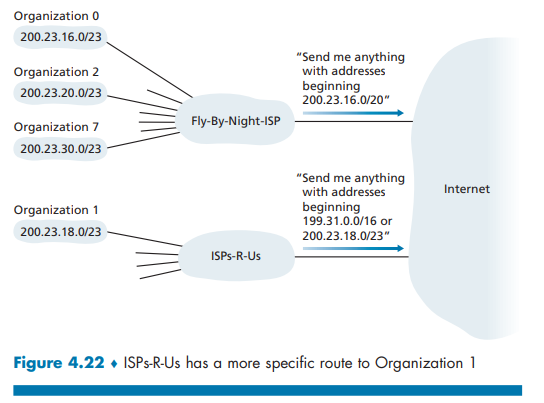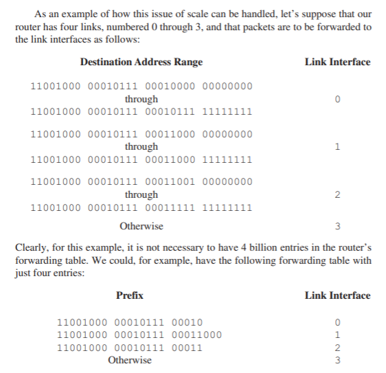 For example, suppose the packet’s destination address is 11001000 00010111 00010110 10100001; because the 21-bit prefix of this address matches the first entry in the table, the router forwards the packet to link interface 0. If a prefix doesn’t match any of the first three entries, then the router forwards the packet to the default interface 3.