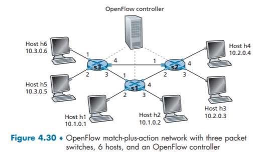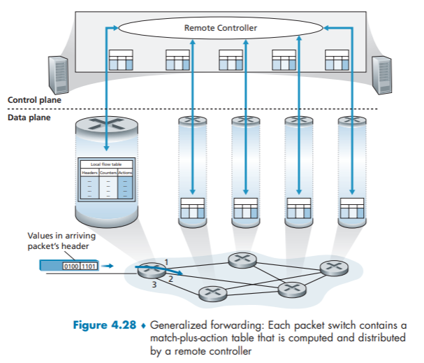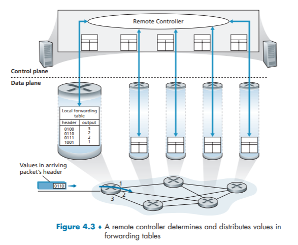 - 图 4.3 中的控制平面方法是 SDN (Software-Defined Networking),顾名思义,计算转发表并与路由器交互的控制器是用软件实现的。