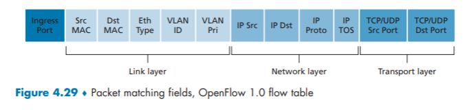 - Modify-field. The values in 10 packet-header fields (all layer 2, 3, and 4 fields shown in Figure 4.29 except the IP Protocol field) may be re-written before the packet is forwarded to the chosen output port.