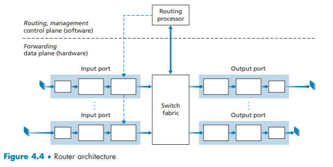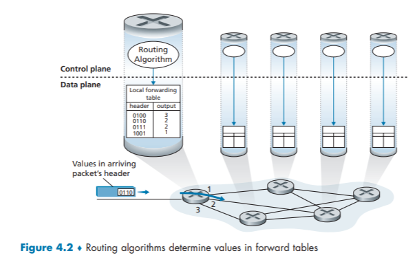 - 转发(一个局部的概念,数据平面):将分组从路由器的输入接口转发到合适的输出接口的路由器本地动作