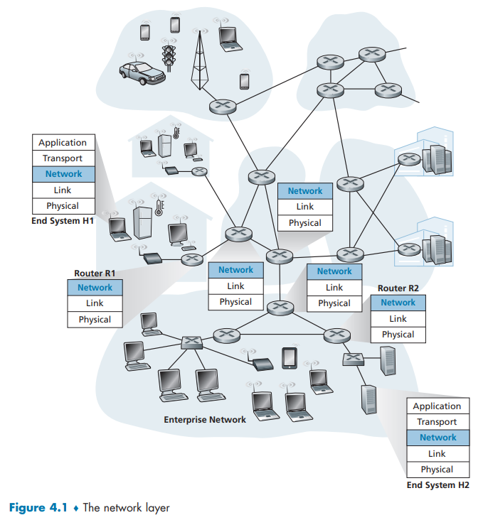 Figure 4.1 shows a simple network with two hosts, H1 and H2, and several routers on the path between H1 and H2. Let’s suppose that H1 is sending information to H2, and consider the role of the network layer in these hosts and in the intervening routers.