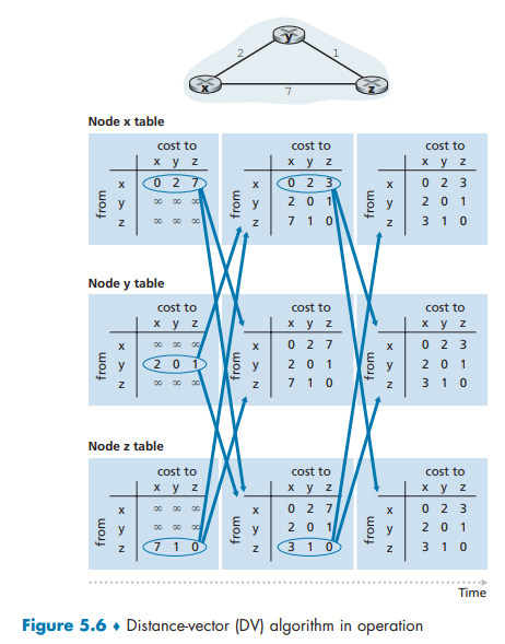 - The decentralized routing algorithm we’ll study below in Section 5.2.2 is called a distance-vector (DV) algorithm, because each node maintains a vector of estimates of the costs (distances) to all other nodes in the network.