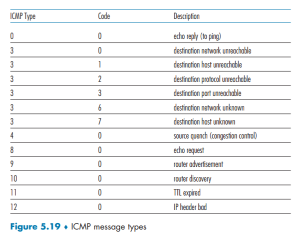ICMP messages have a type and a code field, and contain the header and the first 8 bytes of the IP datagram that caused the ICMP message to be generated in the first place (so that the sender can determine the datagram that caused the error). Selected ICMP message types are shown in Figure 5.19. Note that ICMP messages are used not only for signaling error conditions.