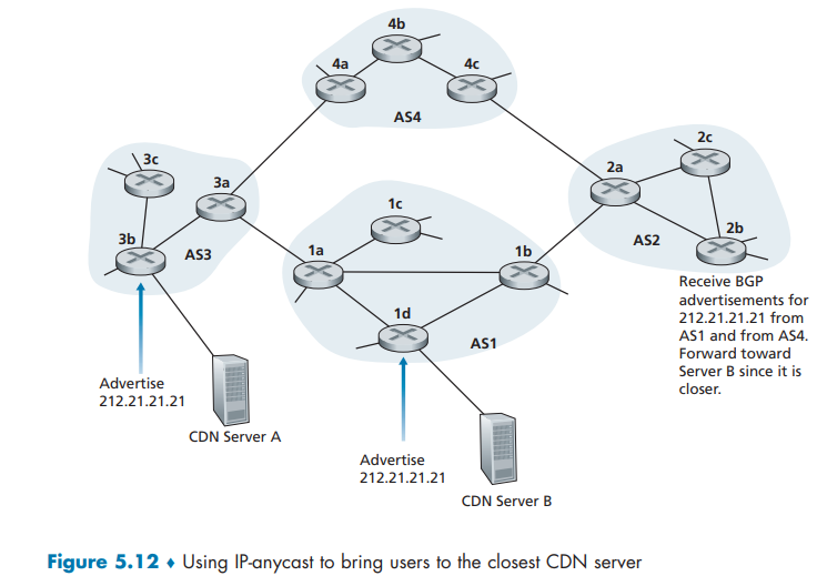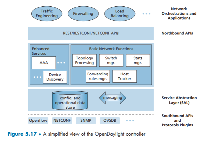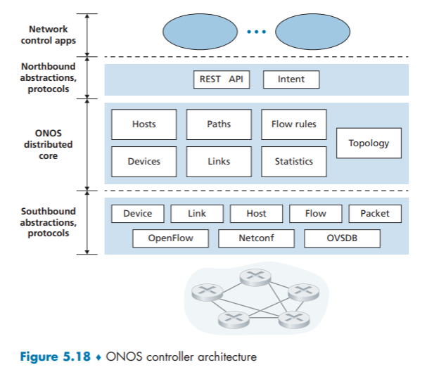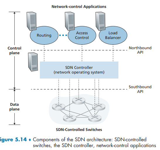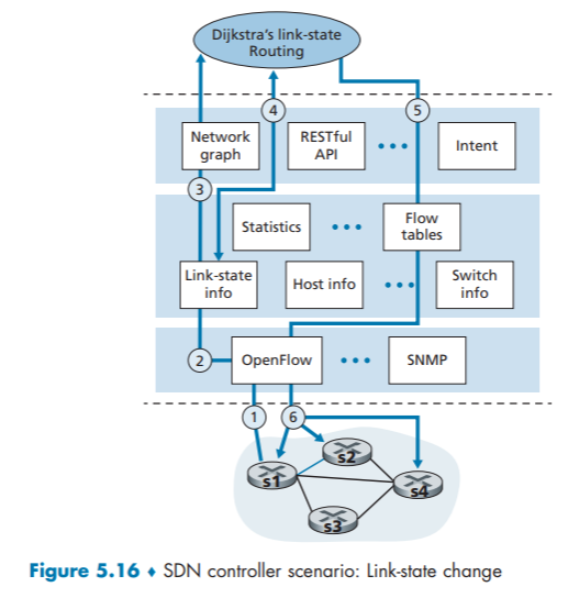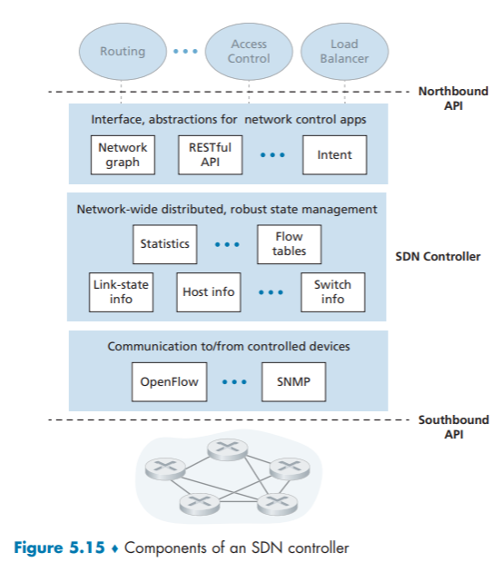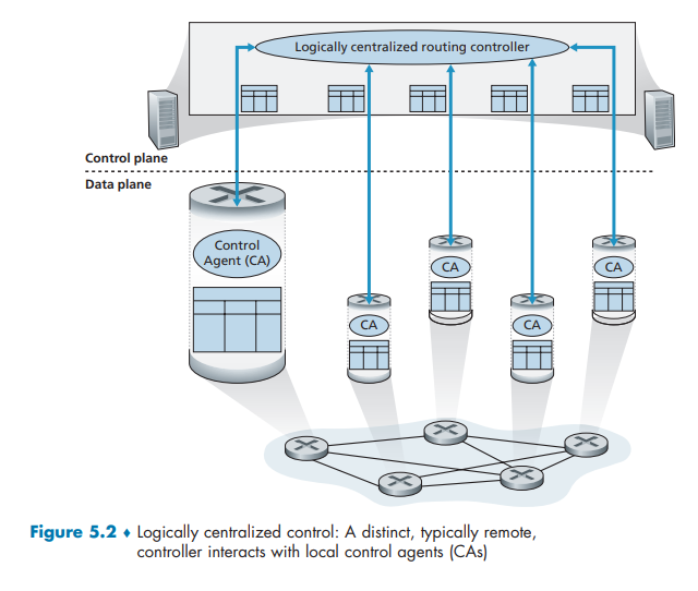 - The controller interacts with a control agent (CA) in each of the routers via a well-defined protocol to configure and manage that router’s flow table. Typically, the CA has minimum functionality; its job is to communicate with the controller, and to do as the controller commands. Unlike the routing algorithms in Figure 5.1, the CAs do not directly interact with each other nor do they actively take part in computing the forwarding table. This is a key distinction between per-router control and logically centralized control