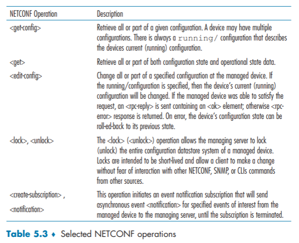 Table 5.3 shows a number of the important NETCONF operations that a managing server can perform at a managed device. As in the case of SNMP, we see operations for retrieving operational state data (), and for event notification. However, the , , and operation demonstrate NETCONF’s particular emphasis on device configuration. Using the basic operations shown in Table 5.3, it is also possible to create a set of more sophisticated network management transactions that either complete atomically (i.e., as a group) and successfully on a set of devices, or are fully reversed and leave the devices in their pre-transaction state. Such multi-device transactions—“enabl[ing] operators to concentrate on the configuration of the network as a whole rather than individual devices” was an important operator requirement put forth in [RFC 3535]. A full description of NETCONF is beyond our scope here; [RFC 6241, RFC 5277, Claise 2019; Schonwalder 2010] provide more in-depth coverage. But since this is the first time we’ve seen protocol messages formatted as an XML document (rather than the traditional message with header fields and message body, e.g., as shown in Figure 5.21 for the SNMP PDU), let’s conclude our brief study of NETCONF with two examples. In the first example, the XML document sent from the managing server to the managed device is a NETCONF command requesting all device configuration and operational data. With this command, the server can learn about the device’s configuration.
