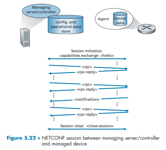 Figure 5.22 shows an example NETCONF session. First, the managing server establishes a secure connection to the managed device. (In NETCONF parlance, the managing server is actually referred to as the “client” and the managed device as the “server,” since the managing server establishes the connection to the managed device. But we’ll ignore that here for consistency with the longer-standing network management server/client terminology shown in Figure 5.20.) Once a secure connection has been established, the managing server and the managed device exchange messages, declaring their “capabilities”—NETCONF functionality that supplements the base NETCONF specification in [RFC 6241]. Interactions between the managing server and managed device take the form of a remote procedure call, using the and messages. These messages are used to retrieve, set, query and modify device configurations, operational data and statistics, and to subscribe to device notifications. Device notifications themselves are proactively sent from managed device to the managing server using NETCONF messages. A session is closed with the <session-close message>.