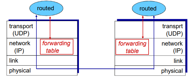 每一台路由器都运行路由选择算法(OSPF、BGP 等),每台路由器都包含转发和路由选择功能。