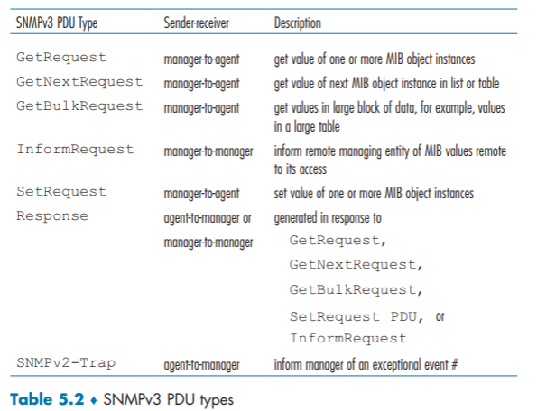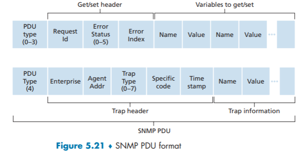The Simple Network Management Protocol version 3 (SNMPv3) [RFC 3410] is an application-layer protocol used to convey network-management control and information messages between a managing server and an agent executing on behalf of that managing server. The most common usage of SNMP is in a request-response mode in which an SNMP managing server sends a request to an SNMP agent, who receives the request, performs some action, and sends a reply to the request. Typically, a request will be used to query (retrieve) or modify (set) MIB object values associated with a managed device. A second common usage of SNMP is for an agent to send an unsolicited message, known as a trap message, to a managing server. Trap messages are used to notify a managing server of an exceptional situation (e.g., a link interface going up or down) that has resulted in changes to MIB object values. MIB objects are specified in a data description language known as SMI (Structure of Management Information) [RFC 2578; RFC 2579; RFC 2580], a rather oddly named component of the network management framework whose name gives no hint of its functionality. A formal definition language is used to ensure that the syntax and semantics of the network management data are well defined and unambiguous. Related MIB objects are gathered into MIB modules. As of late 2019, there are more than 400 MIB related RFCs and a much larger number of vendor-specific (private) MIB modules. SNMPv3 defines seven types of messages, known generically as protocol data units—PDUs—as shown in Table 5.2 and described below. The format of the PDU is shown in Figure 5.21.