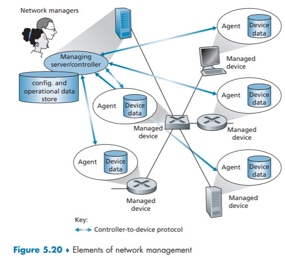 - Data. Each managed device will have data, also known as “state,” associated with it. There are several different types of data. Configuration data is device information explicitly configured by the network manager, for example, a manager-assigned/ configured IP address or interface speed for a device interface. Operational data is information that the device acquires as it operates, for example, the list of immediate neighbors in OSPF protocol. Device statistics are status indicators and counts that are updated as the device operators (e.g., the number of dropped packets on an interface, or the device’s cooling fan speed). The network manager can query remote device data, and in some cases, control the remote device by writing device data values, as discussed below. As shown in Figure 5.17, the managing server also maintains its own copy of configuration, operational and statistics data from its managed devices as well as network-wide data (e.g., the network’s topology).