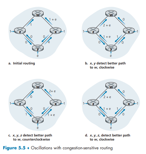 [McQuillan 1980], a number of difficulties were encountered[Huitema 1998]. - Today’s Internet routing algorithms (such as RIP, OSPF, and BGP) are load-insensitive, as a link’s cost does not explicitly reflect its current (or recent past) level of congestion.