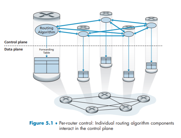 - Per-router control. Figure 5.1 illustrates the case where a routing algorithm runs in each and every router; both a forwarding and a routing function are contained within each router. Each router has a routing component that communicates with the routing components in other routers to compute the values for its forwarding table. This per-router control approach has been used in the Internet for decades. The OSPF and BGP protocols that we’ll study in Sections 5.3 and 5.4 are based on this per-router approach to control.