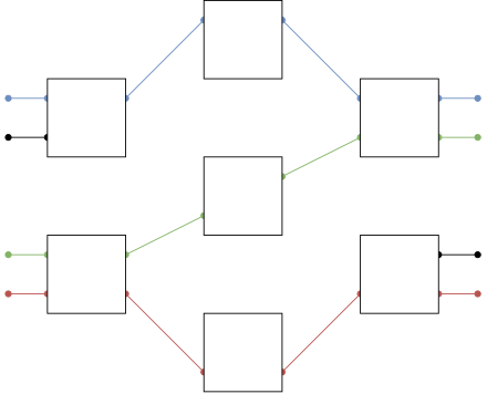 The below diagram shows the worst case when the already established calls (blue and red) are passing different middle-stage switches, so another middle-stage switch is necessary to establish a call between the green input and output.