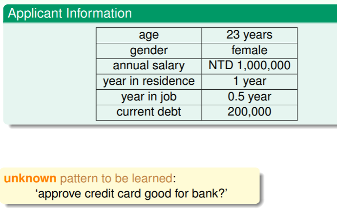 以银行批准申请信用卡为例,提出 ML 的数学标记: