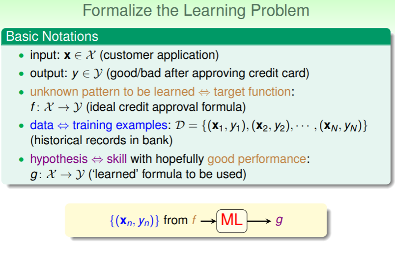 - 假设集 是对这个未定的映射 f 的估计的集合,训练的过程就是通过对数据的学习找到其中最好的一个假设,即是 g ;