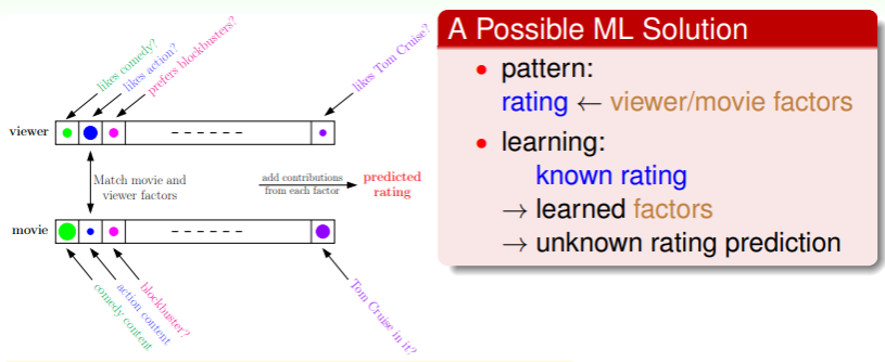 - 对用户喜好和电影特点分别做特征提取——得到特征向量,二者特征向量内积,高者代表用户喜好与本电影的特点匹配程度更高,于是将本电影推荐给该用户