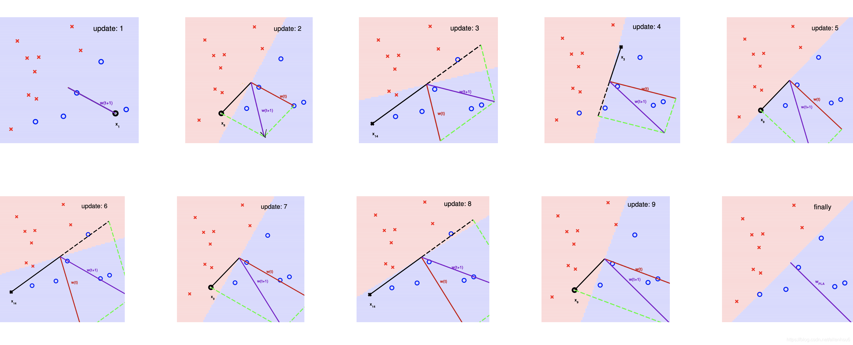 - 我们也不知道究竟要运行多久才会停下来,因为 是取决于 的——甚至一旦不是线性可分的,比如有噪音点或非线性可分区域,将无法停止。