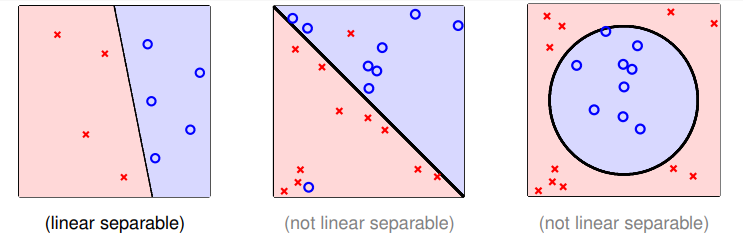 - 下图左边是线性可分的,中间和右边不是线性可分的: