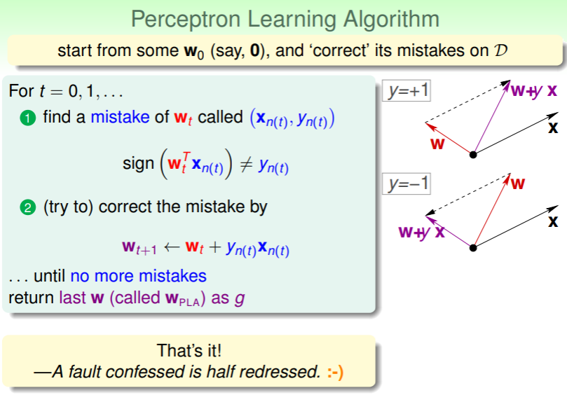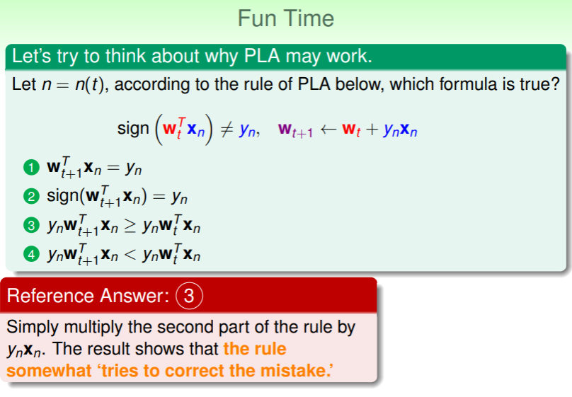 - PLA 的过程就是 当前轮次的权重 越来越接近 目标函数的权重 的过程,