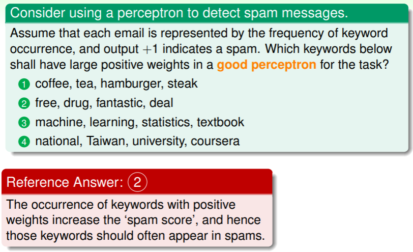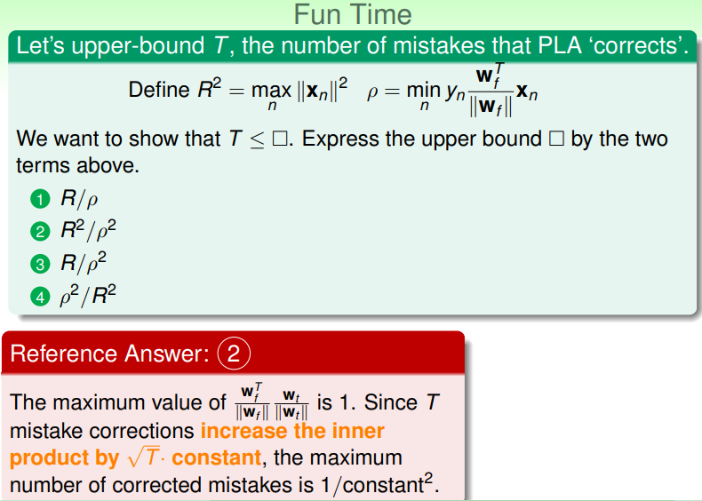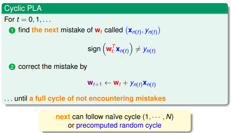- 对第 2 个问题——只有训练集满足线性可分,才能够确保 PLA 最终能够停止。