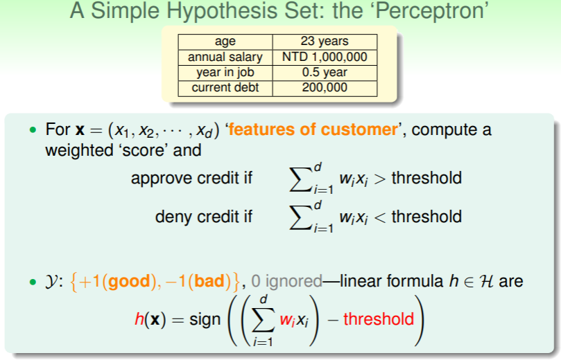- 对每一个分量 赋以权重 ,二者相乘后求和,即可得到该客户的特征——从而验证能否通过批准信用卡的阈值 threshold ,