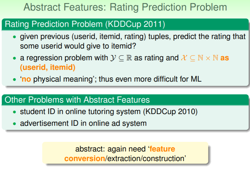 - 仅凭 ID 当然无法确定评分的结果,因此仍然需要特征提取——这就是另一门学问,特征工程(Feature Engineering)