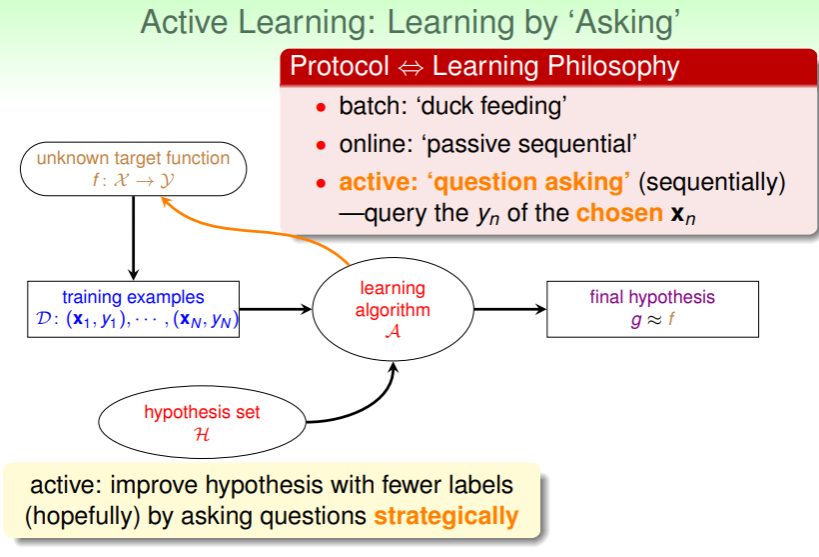 - 无论 batch learning 还是 online learning,模型都是被动地接受数据的特征,而 active learning 则是机器主动地阐述对数据的困惑,等待建模者的回答;
