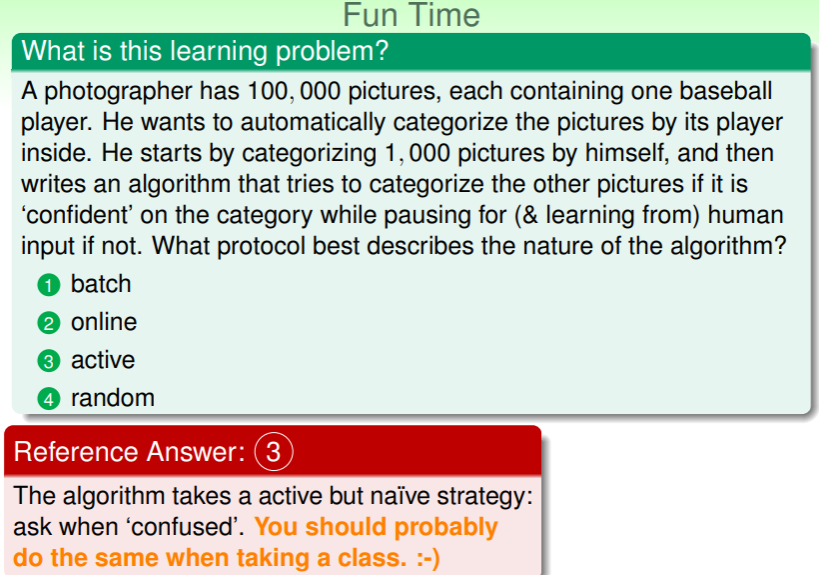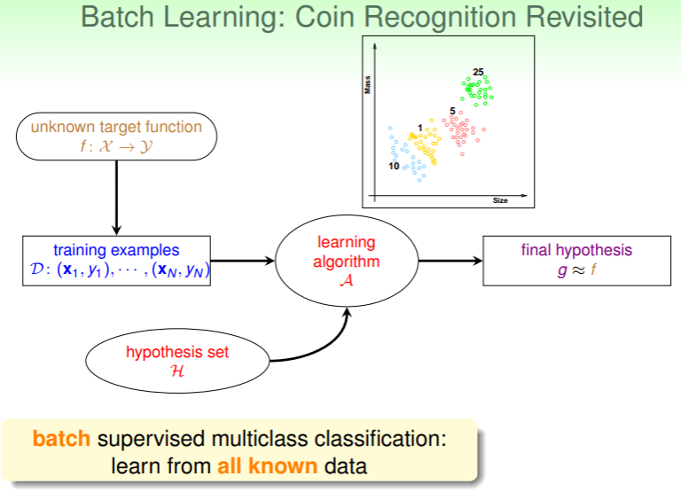 - 更多 batch learning 案例:从一大堆已知邮件是否为垃圾的数据中学习得到垃圾邮件过滤器……